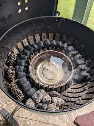 For best results, stack briquettes two rows deep in a “snake” around the ring, add wood chunks, and light one end to burn slowly across the cook. Place a water pan in the center above the diffuser to stabilize temps and add moisture.